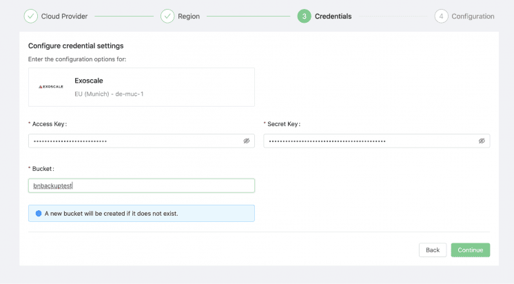3. Enter the Exoscale credentials. It is good practice to create a new dedicated bucket and IAM key for that purpose, ideally restricted to the specific bucket and only to the needed operations. You can then indicate the bucket name in the Backup Ninja wizard.