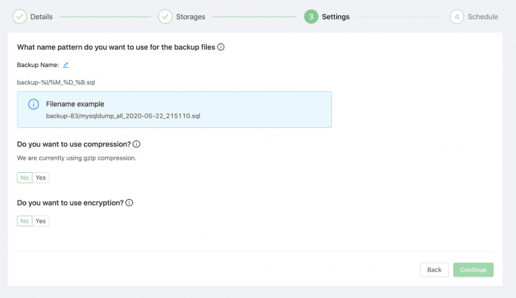 Backup Ninja lets you schedule backups with full flexibility, would that be once a day at off hours or every few minutes. You can also control how long your backups are stored. It uses both encryption at-rest as well as in-transit when processing and storing your backup files. Keys are stored on your server, creating full-360 security.
